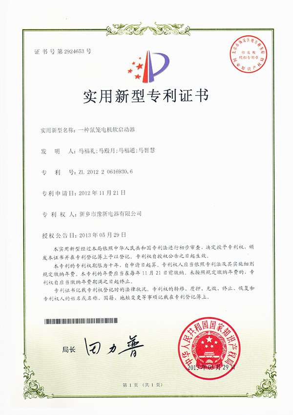 一種鼠籠電機(jī)啟動(dòng)柜專利證書