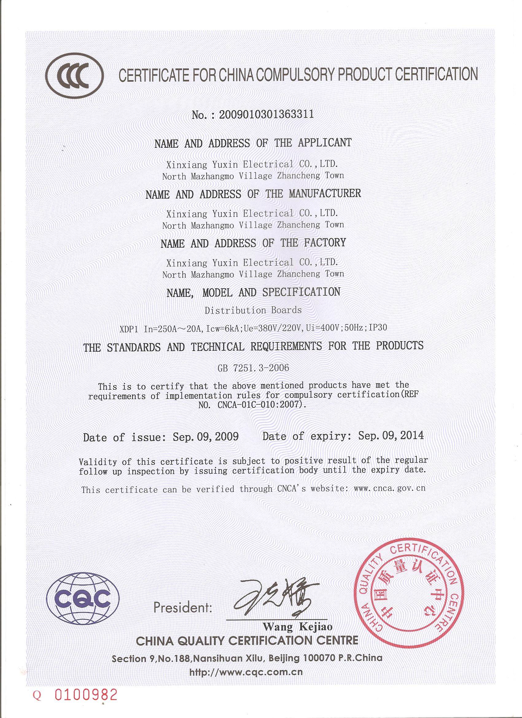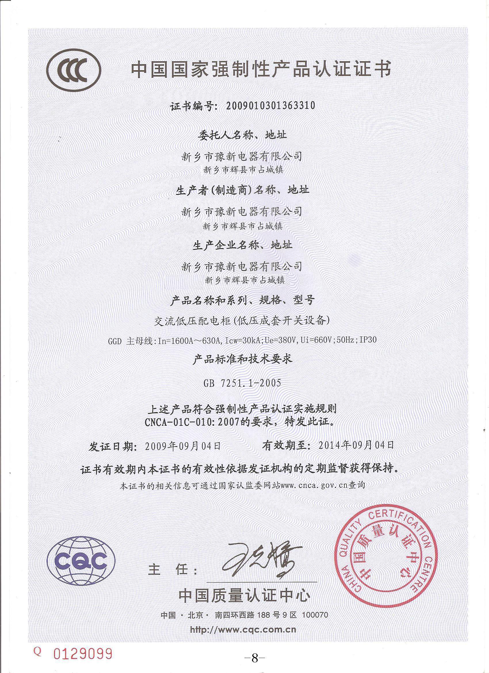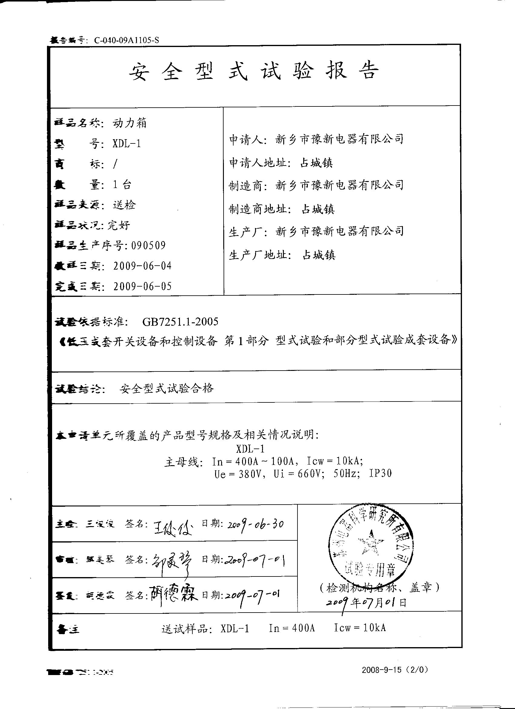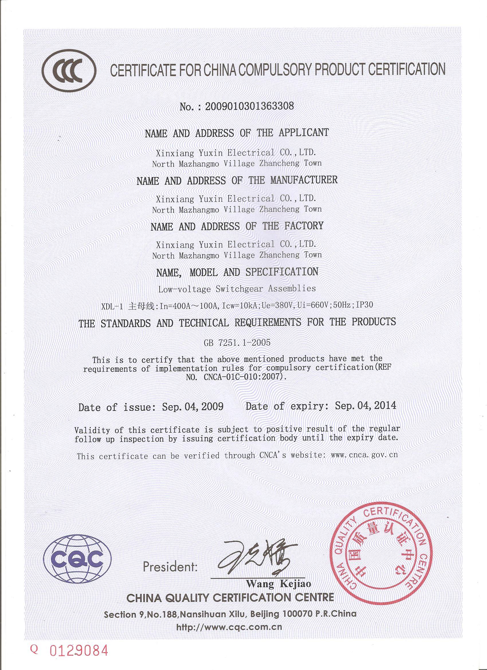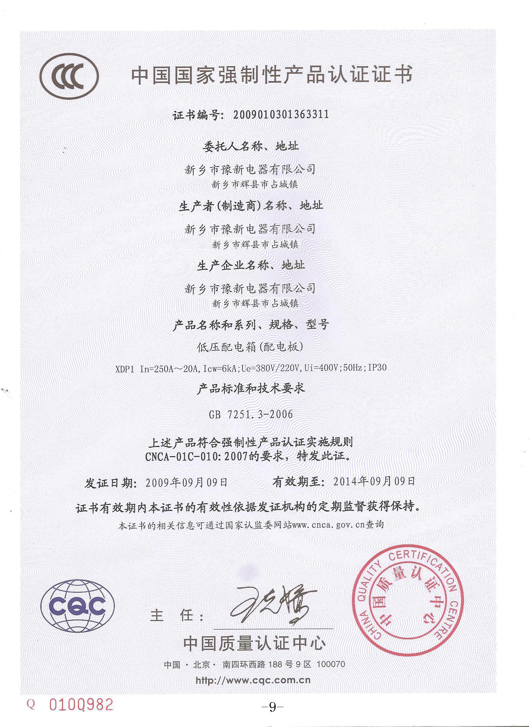 XDL1-400動(dòng)力控制箱國家3C認(rèn)證證書{中}